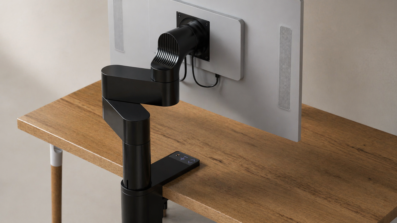 A base-mounted camera system tracked users and communicated with the control software, enabling automated positional adjustments. The arm also integrated HDMI and power passthrough to maintain a clean, single-cable connection to the monitor.